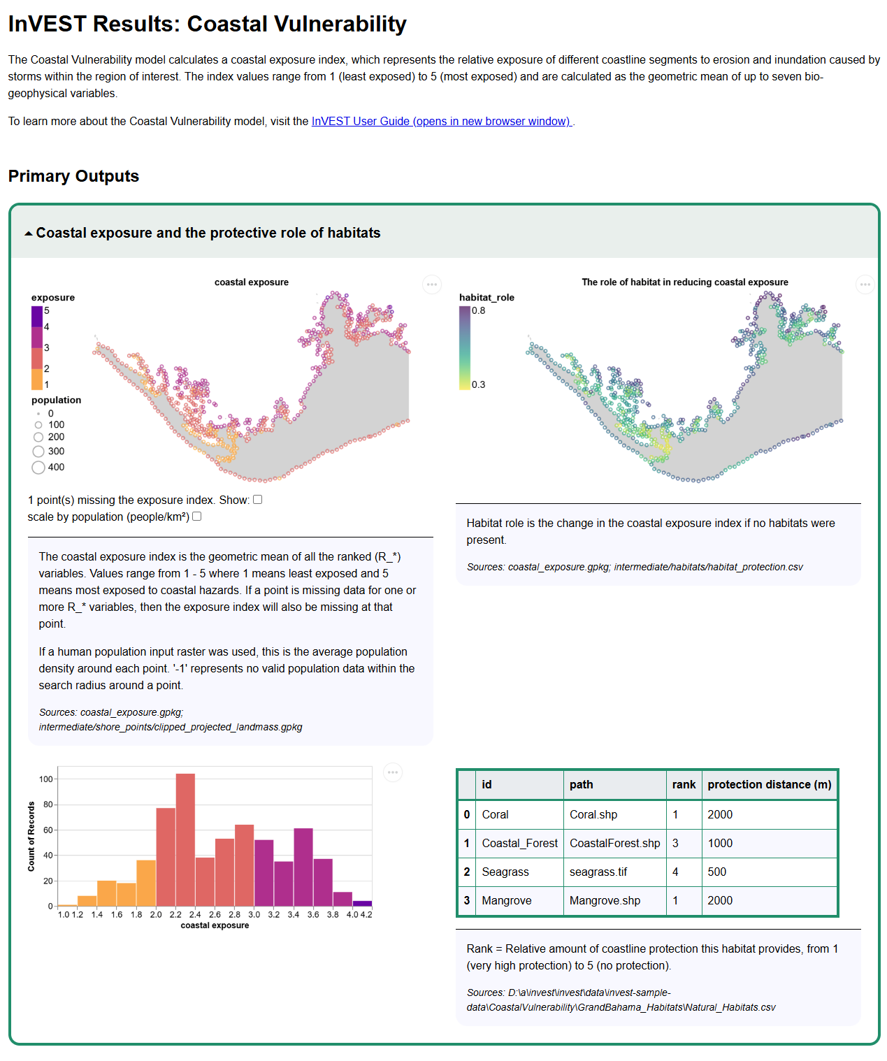 As of InVEST 3.18.0, the Carbon, Coastal Vulnerability, SDR, and NDR models generate visual summaries of results that provide maps, plots, tables, and descriptions for select inputs and outputs of a model workspace. InVEST Workbench users will see a new “view results” button upon model completion that will open the report. The report is a self-contained html file, which means it can also be shared with colleagues and viewed directly in any web browser.